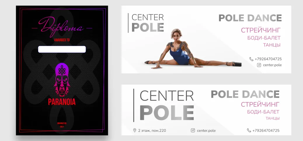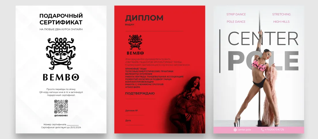 Мы разработали и внедрили лого и фирменный стиль для Center pole, которые гармонично дополняют основной бренд Евы Бембо и подчеркивают уникальность нового направления. В дополнение к этому, мы продолжаем поддерживать активное сотрудничество, разрабатывая разнообразные рекламные и информационные материалы, включая web-баннеры, полиграфию и дипломы, что способствует укреплению бренда и привлечению новых клиентов в школу танцев. Эта работа помогает школе поддерживать свою актуальность на рынке и расширять предложения для своих клиентов.